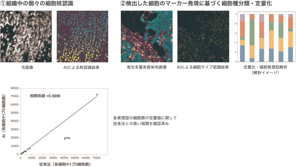 乳がん・大腸がん・膵がんといった複数癌腫で解析を行い、従来法に劣らない細胞核認識精度・細胞種別定量結果を得られることを確認しています。 今後は対応癌腫の拡大や、空間オミクス解析など他の実験手法で得られるデータと組み合わせた解析を行うことで、がん微小環境における定量的空間解析が実現できると期待されます。