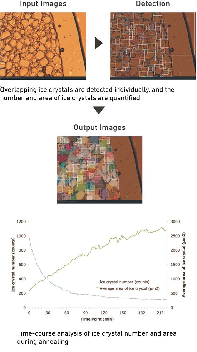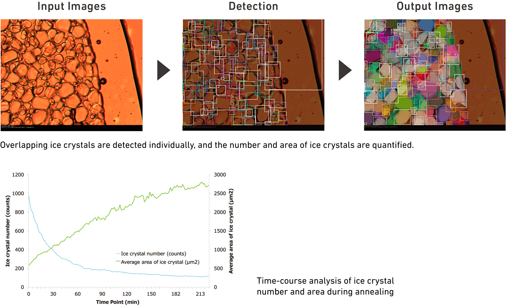 In the freeze-drying (lyophilization) process commonly used for biologics, annealing—a step in which the temperature is briefly raised after initial freezing and then lowered again to complete solidification—plays a crucial role. This process promotes and homogenizes ice crystal growth, contributing to the production of formulations with superior appearance, high transport stability, and uniform quality. To optimize ice crystal growth, microscopic observation of ice crystal formation during annealing is essential. However, manually observing all crystals throughout the process is time-consuming and prone to variability between evaluators. Moreover, it is difficult to accurately separate overlapping ice crystals and to quantitatively evaluate the number and area of crystals over time.