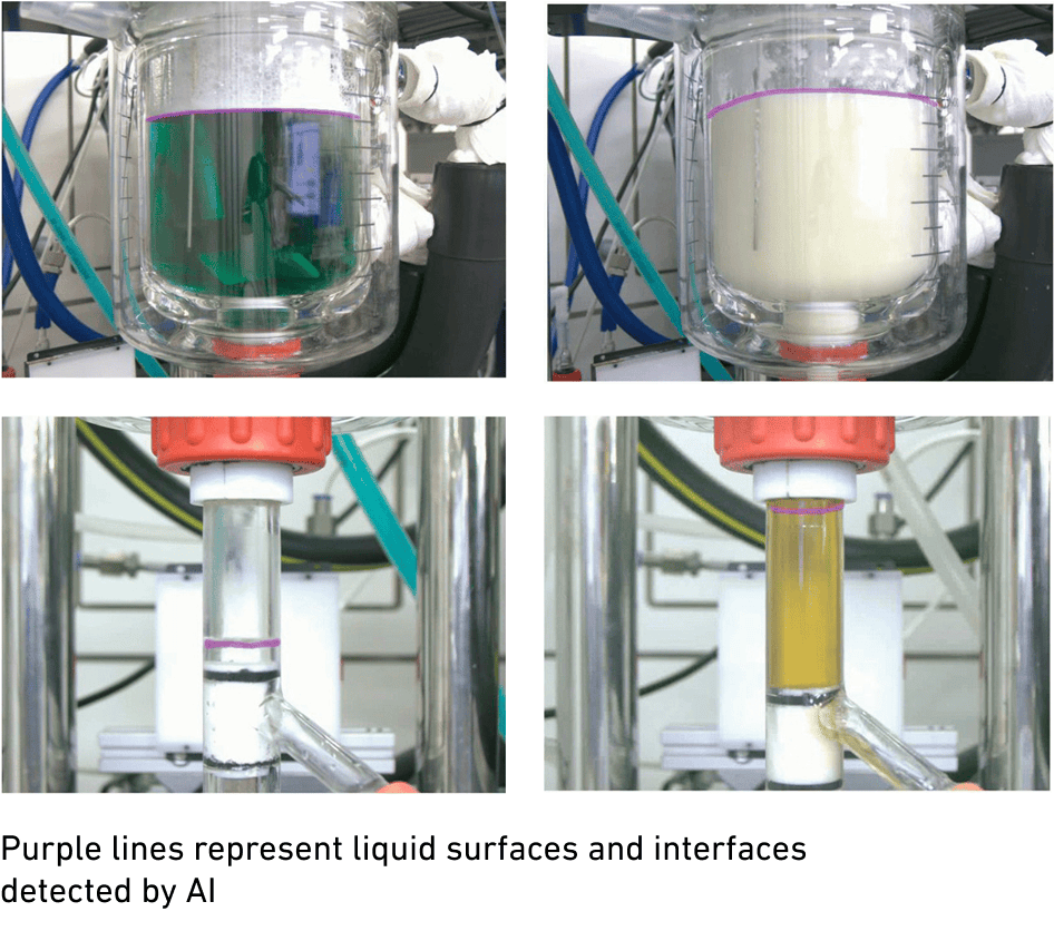 By applying AI-based image analysis, liquid levels and interfaces inside reactors can be accurately detected, enabling precise volume measurement and reliable interface detection during liquid separation. To ensure robust performance in practical use, the AI model was trained to handle a wide range of conditions. As a result, it maintains high accuracy even in challenging situations involving foaming, residue on vessel surfaces, or variations in solution color—issues that conventional image-processing systems struggled to overcome. The introduction of this technology is expected to improve experimental reproducibility, reduce variability caused by manual operations, and enhance overall process efficiency while reducing the workload of researchers.