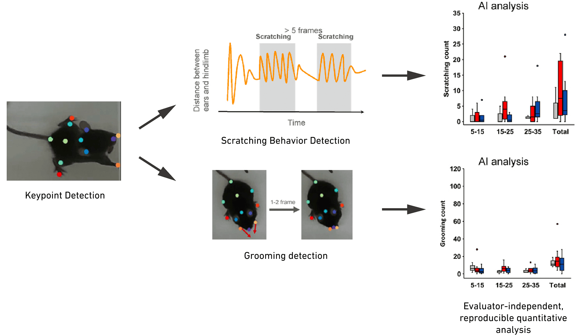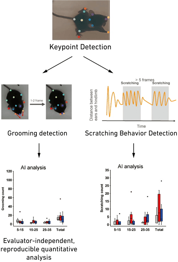 By extracting anatomical key points from video—such as the ears, nose, limbs, and tail—a wide range of behavioural parameters can be derived, such as posture and movement speed. This enables both a comprehensive understanding of each specimen’s behavioral characteristics and precise quantitative analysis of specific actions (e.g., tremors or pruritic behavior).